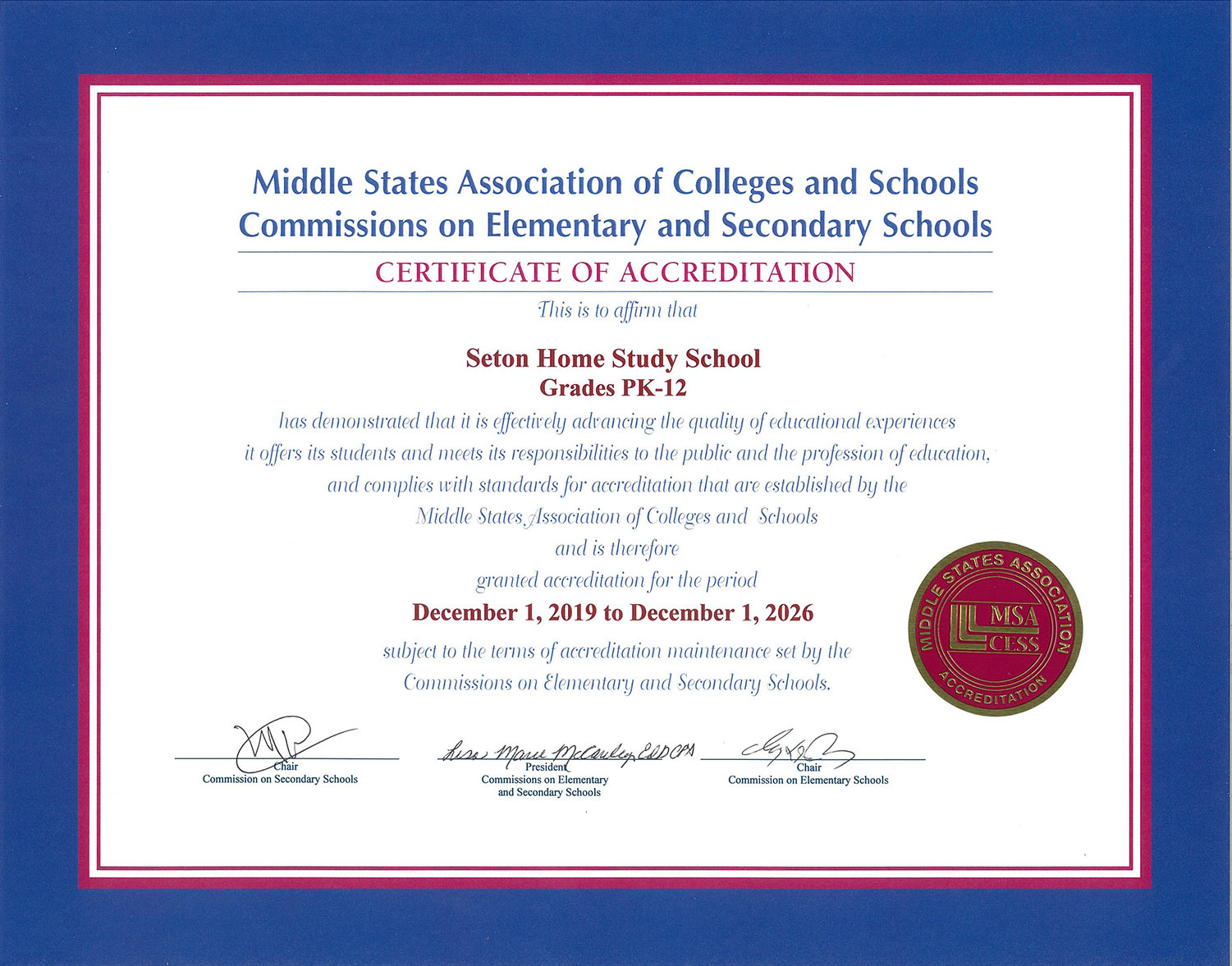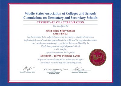 Yes, Seton Home Study School is accredited by Middle States Association of Colleges and Schools, which is recognized by the United States Department of Education. Our listing in the online Database of Accredited Schools can be found by clicking here.